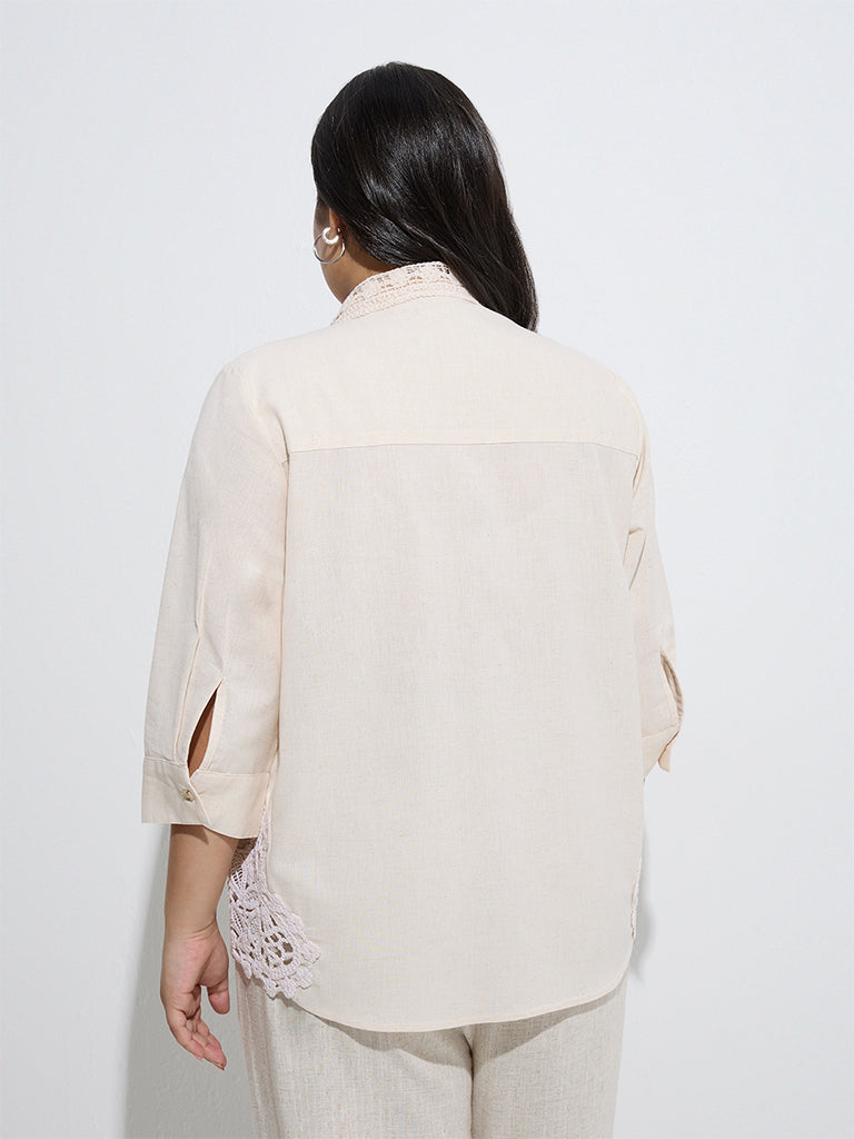This beige shirt from Gia is spun from pure cotton and flaunts intricate lace detailing on the collar and sides. Styled with three-quarter sleeves and a button placket, it blends classic design with subtle feminine touches.