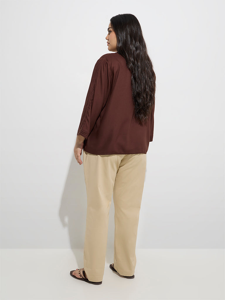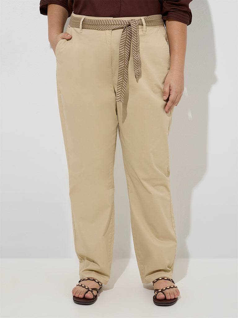 Gia Beige Solid High-Rise Cotton-Blend Trousers with Belt