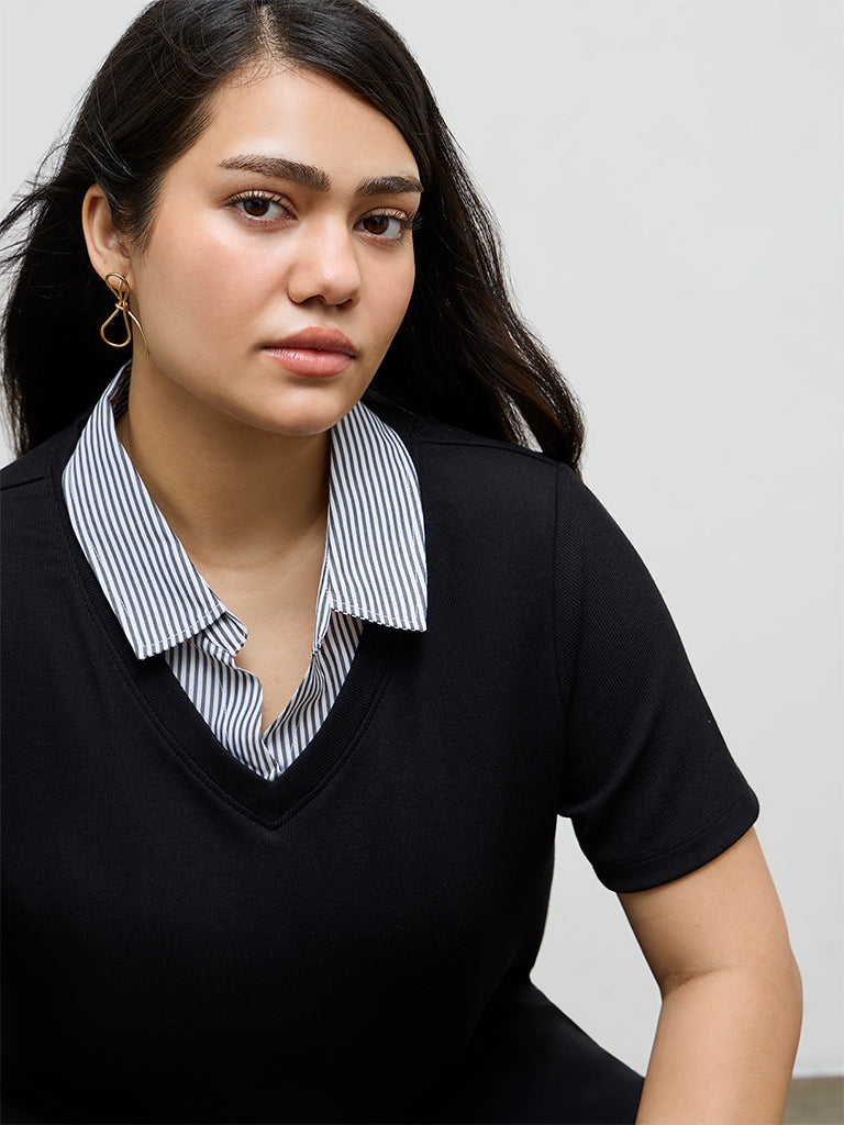 Gia presents this black top designed with a layered look that adds a smart, contemporary touch to the silhouette. Crafted from a breathable fabric, it offers comfort through the day. The design features a collared neckline with a striped shirt-style collar detail and short sleeves, creating a polished profile suited for both work and casual settings.