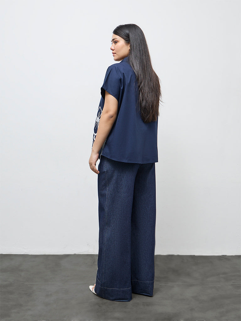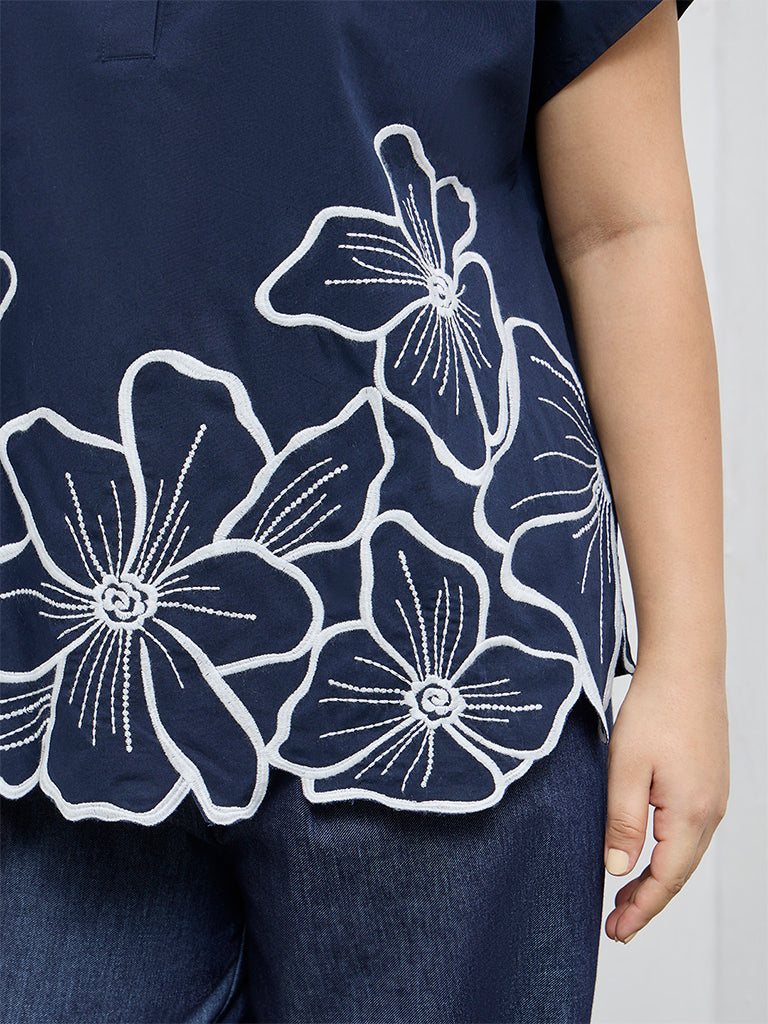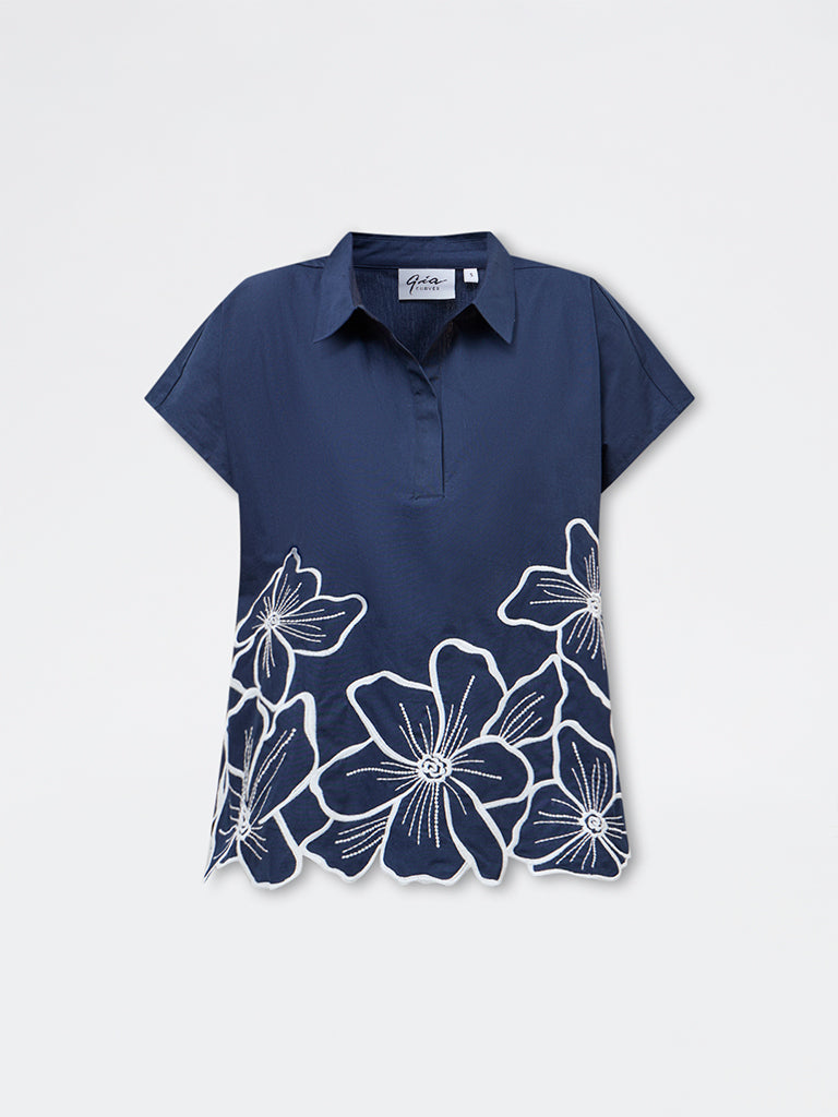 Gia Navy Floral Embroidered Cotton Blouse
