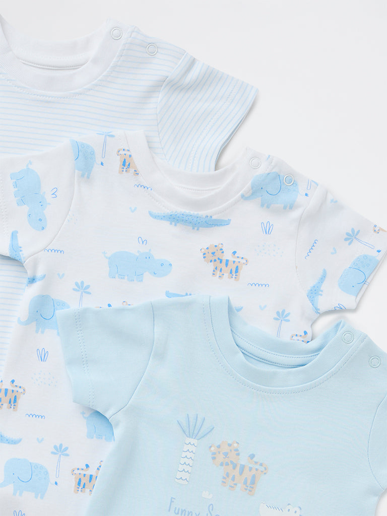 Cute, comfy, and made for everyday moments, this set from HOP Baby includes three charming rompers crafted from soft, breathable cotton. The collection features a blue piece with playful all-over prints, a white option with a central animal graphic, and a blue striped design. Each romper is styled with a crew neck and snap-button closures at the crotch for easy dressing and quick diaper changes.