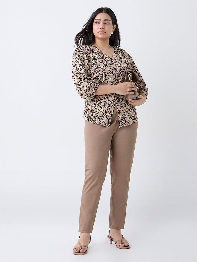 Soft, feminine, and thoughtfully crafted, this brown blouse from Gia features delicate foliage prints that bring gentle character to the silhouette. The sumptuous fabric drapes comfortably, while the V-neckline flows into a concealed button placket for a clean, elongating finish. Three-quarter sleeves complete the look, making it a versatile choice for both work and relaxed outings.