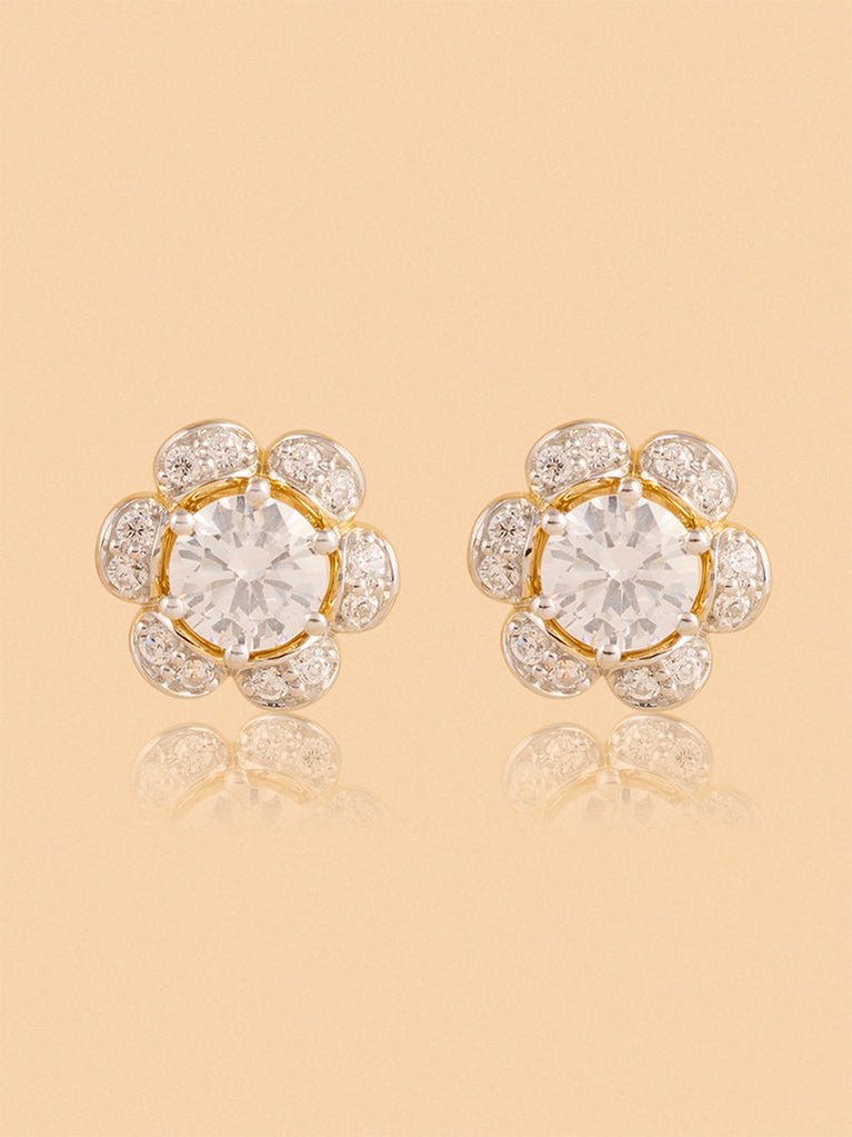 These floral earrings from Westside X Pome bring a touch of timeless elegance to any ensemble. Crafted with a gold-tone finish, they feature a central clear stone encircled by smaller stones, forming a delicate clustered design. Secured with a post-back closure for a comfortable fit, these earrings effortlessly add a hint of sparkle to both everyday looks and special occasions.