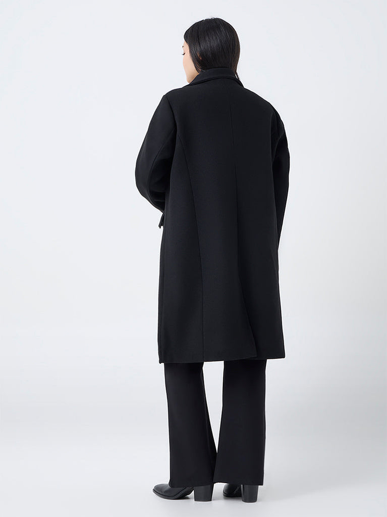 Gia presents this black trench coat crafted from a luxe fabric that brings sophistication to winter layering. The notched lapel collar and sleek button placket offer a clean, tailored finish, while dual welt pockets add function without disrupting the refined silhouette.