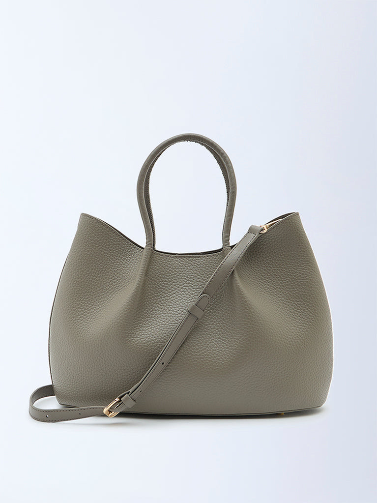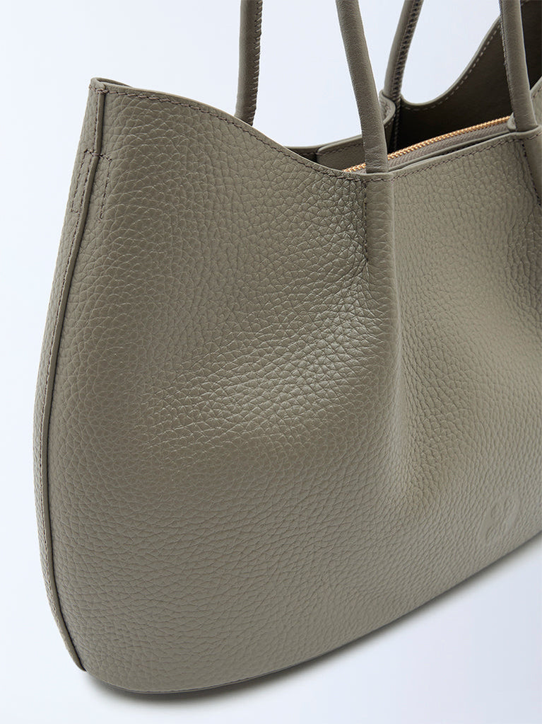 Details•Stone grey grain leather•Quality lining•Detachable shoulder strap with pouch•Internal gold zip and slip pockets•Protective gold feet