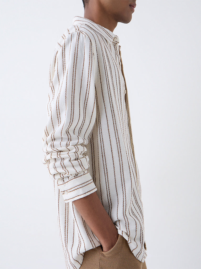 ETA introduces a clean, versatile essential with this off-white shirt, defined by embroidered stripes that add quiet structure to the relaxed silhouette. Cut from a breathable woven fabric, it keeps you comfortable from morning commutes to evening downtime. Finished with a classic collar, full sleeves and a buttoned front, it adapts easily to smart-casual plans or polished weekend dressing.