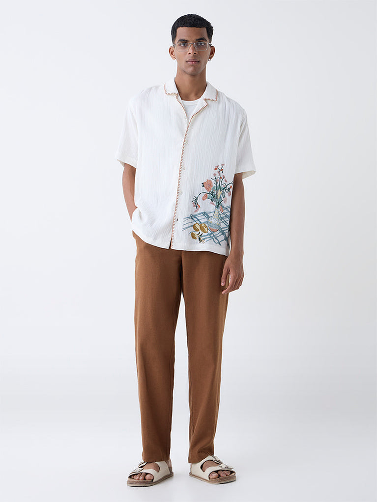 ETA White Floral Embroidered Relaxed-Fit Cotton Shirt