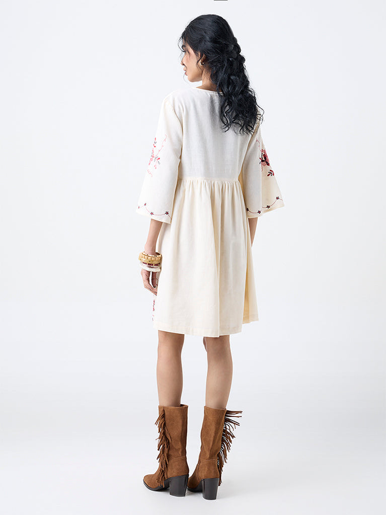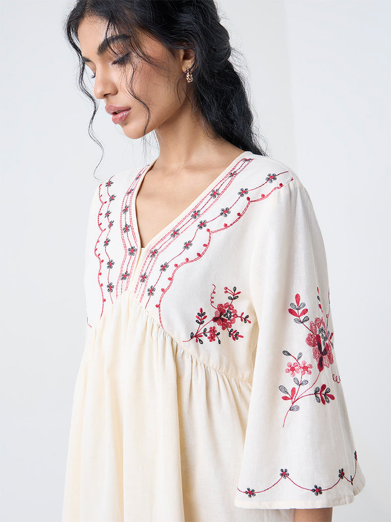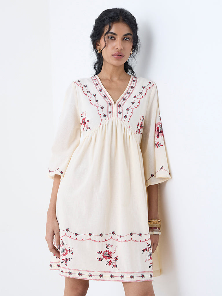 Light and easy by design, this off-white dress from Bombay Paisley captures breezy daytime elegance. The A-line silhouette features vibrant floral embroidery that adds artisanal colour, while the V-neck and bell sleeves create gentle movement. Crafted from a comfortable cotton-blend fabric, it’s an uncomplicated choice for warm days, garden brunches and effortless holiday dressing.