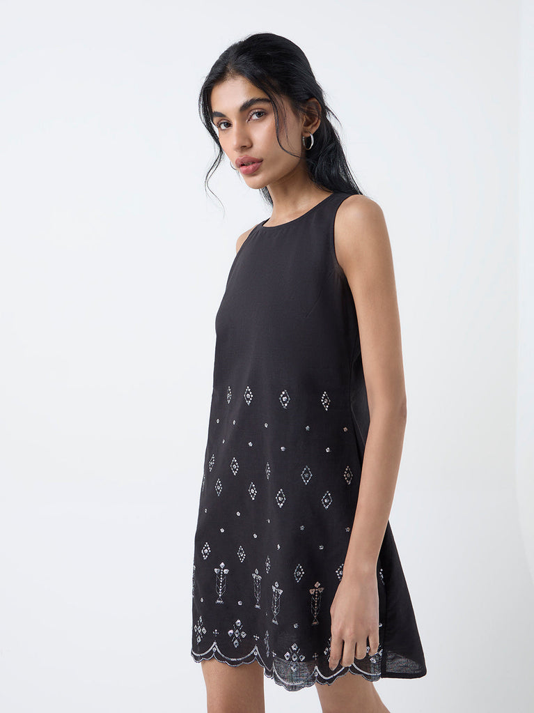 Make a festive statement with this black shift dress from Bombay Paisley, where shimmering sequin work takes center stage. Cut from pure cotton for breathable ease, it features a round neckline and sleeveless profile that keeps the silhouette sleek and modern. Scalloped edges bring a delicate, handcrafted finish.