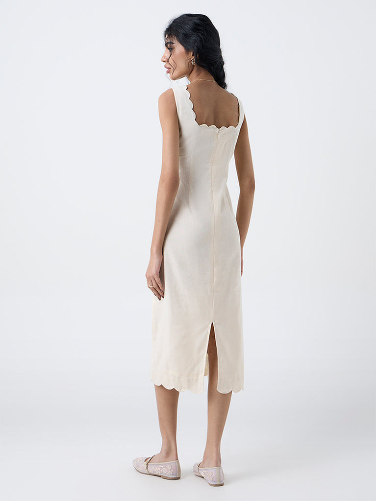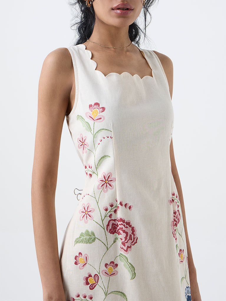 Bombay Paisley brings a bright update to daytime dressing with this cream dress, defined by vivid floral printed panels that add colour and movement. The straight silhouette is styled with a square neck, scalloped straps and coordinating scalloping at the hem for a handcrafted finish. Made from a breathable cotton-rich fabric and secured with a back zipper, it is an easy choice for relaxed summer plans.