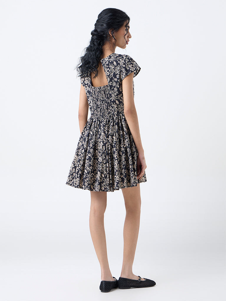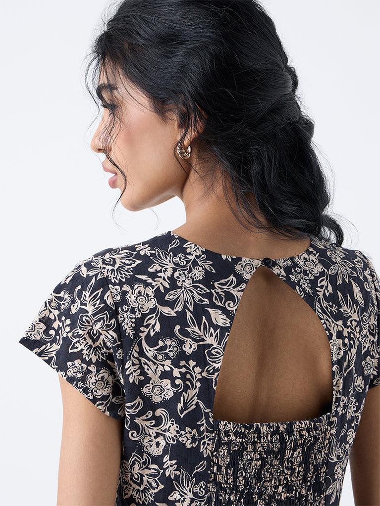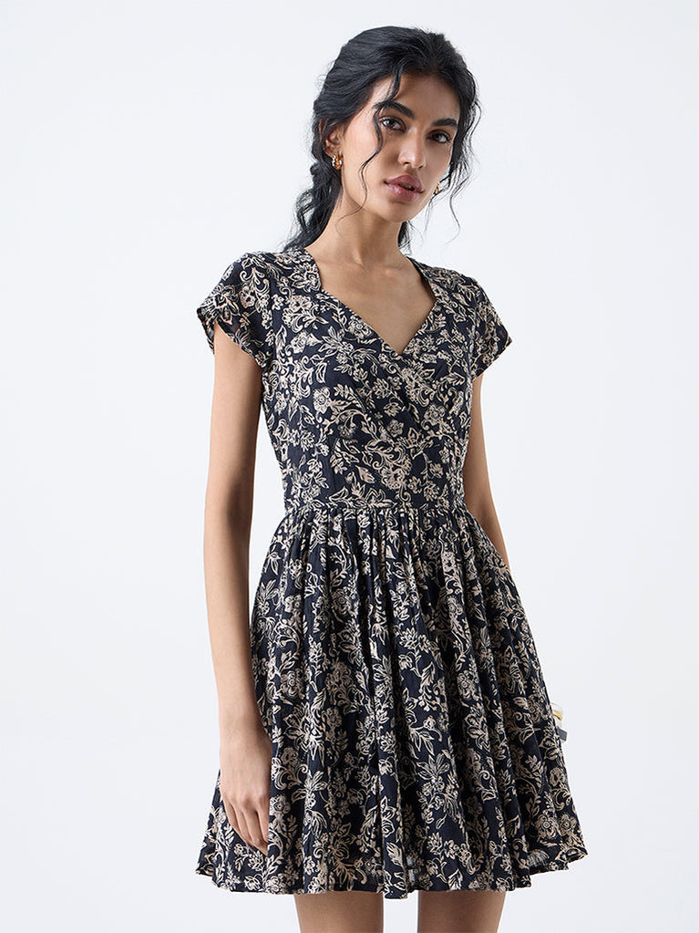 This black dress from Bombay Paisley brings a fresh, outdoorsy spirit to everyday dressing. Falling into a breezy A-line silhouette, it is adorned with lively foliage prints that capture a cheerful, daytime vibe. The V-neck and cap sleeves keep the shape light, while the cut-out detail and smocked back offer breathable comfort. Crafted from a cotton-rich fabric and finished with side pockets, it is made for easy movement and all-day practicality.