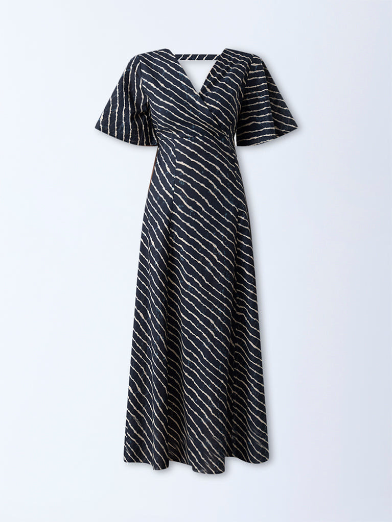 Blending traditional charm with a contemporary twist, this blue dress from Bombay Paisley channels effortless Indo-Western style. Showcasing a striped pattern that radiates playful energy, it’s spun from pure cotton for all-day comfort. A flattering V-neck, angel sleeves, and a flowing A-line silhouette complete the look with bohemian elegance.