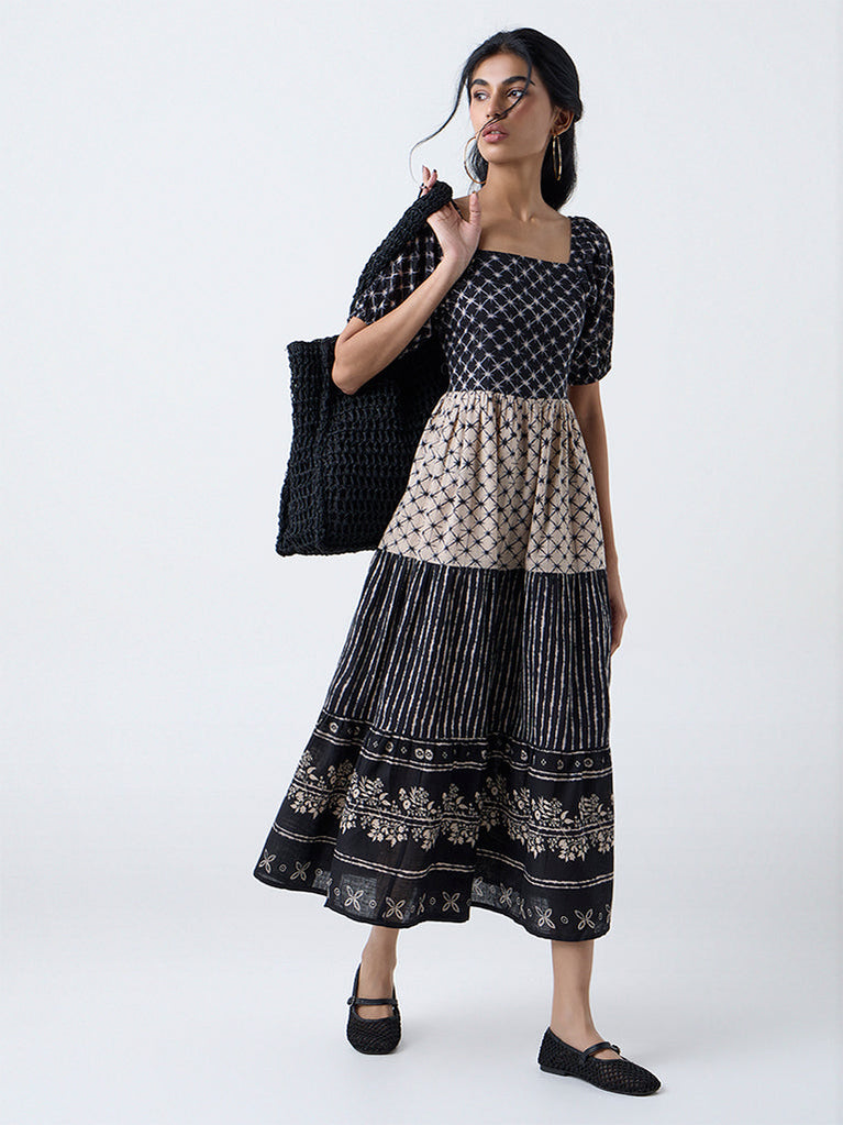 Bombay Paisley Black Printed Cotton Tiered Dress