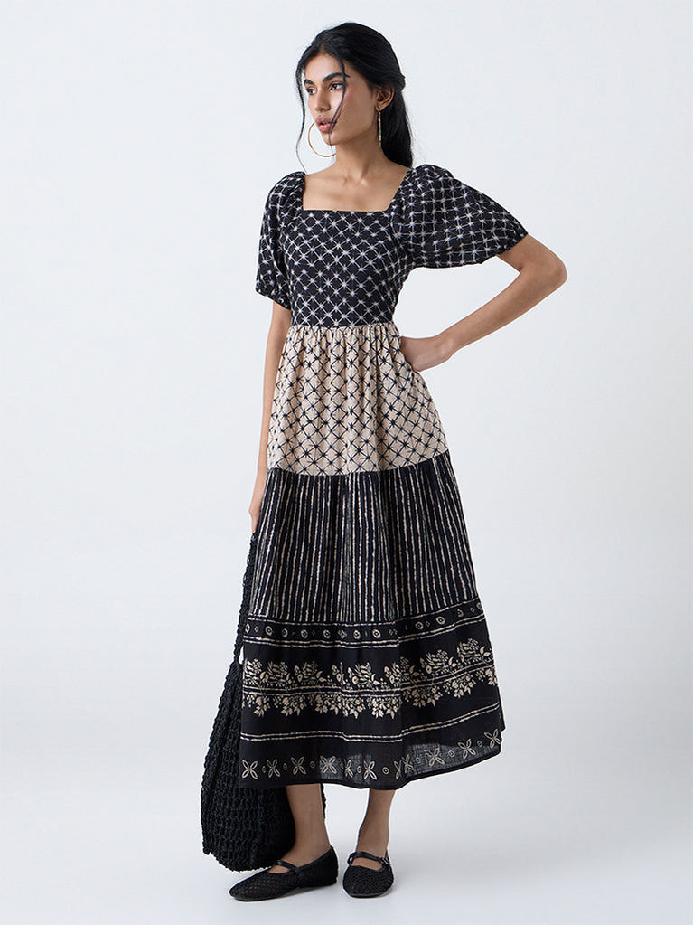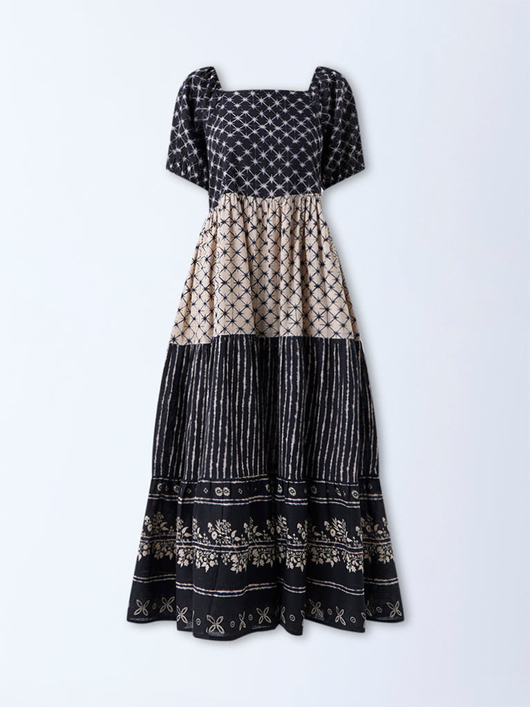 Bombay Paisley Black Embroidered Cotton Tiered Dress