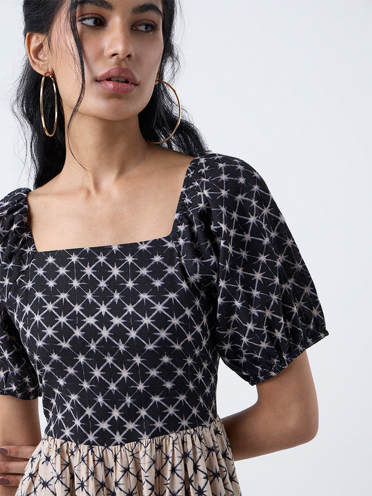 Easy, breezy and made for sunny days, this black dress from Bombay Paisley sets a relaxed holiday mood. Crafted from a soft cotton-rich fabric, the bodice features charming embroidery, while the tiered frame blends contrasting ethnic prints for a playful visual mix. Finished with a square neck and adjustable straps, it is the perfect throw-on piece for brunches, strolls or carefree weekend plans.