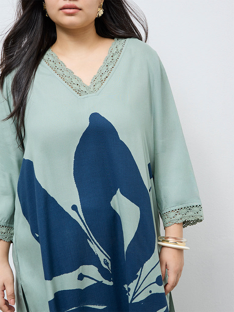 This mint kurta from Diza features a large floral motif that brings a fresh, traditional touch to the design. Cut in an A-line silhouette, it is crafted from a breathable fabric that allows ease of movement through the day. A V-neck and full sleeves decorated with a lace trim defines the shape, while side pockets add a practical element.
