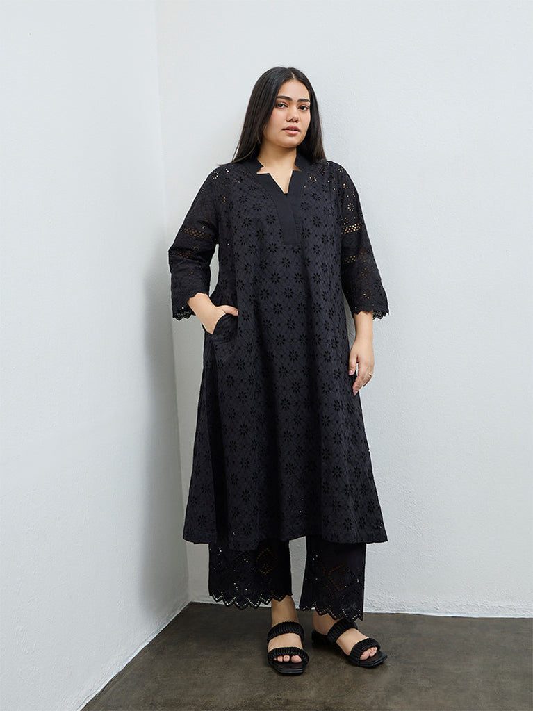 Diza Black Schiffli Embroidered A-Line Cotton Kurta