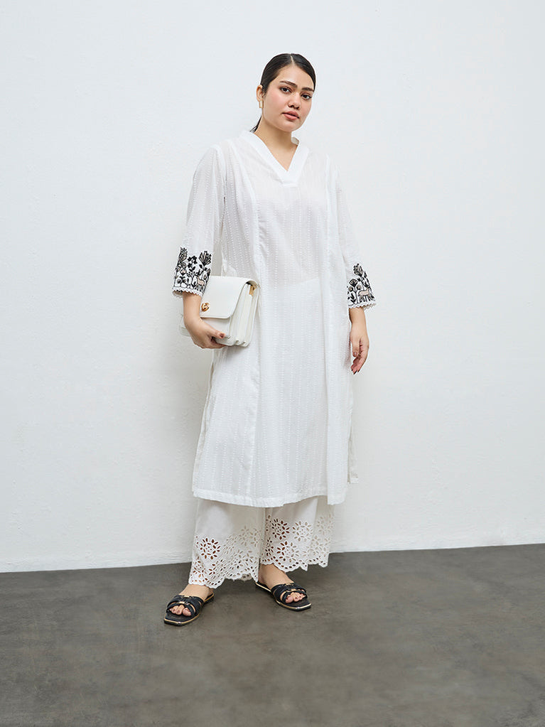 This white kurta from Diza features textured details on an A-line silhouette, elevating the traditional appeal. It is crafted from a pure cotton fabric that allows ease of movement through the day. A V-neck and three-quarter sleeves decorated with floral embroidery defines the shape, while side pockets add a practical element.