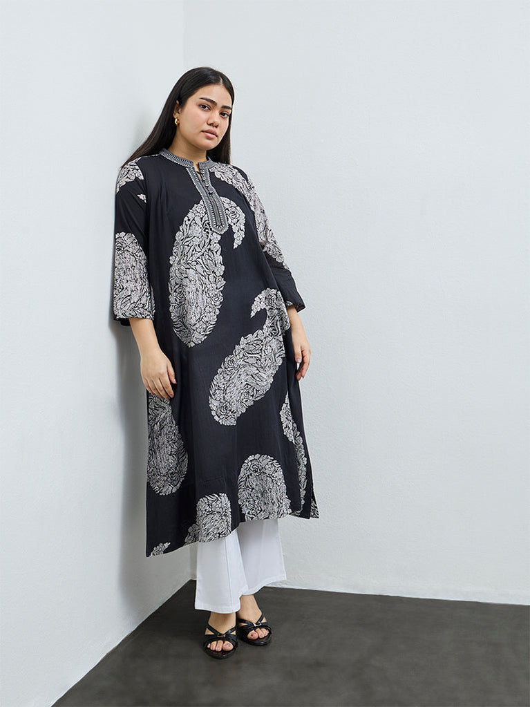 Rich in traditional character, this black kurta from Diza is crafted from a lightweight premium fabric that feels comfortable through long festive hours. The A-line silhouette is adorned with an all-over paisley print, while embroidery along the band collar and button placket adds a handcrafted touch. Finished with three-quarter sleeves, it is an elegant choice for celebrations, family gatherings, and cultural occasions.