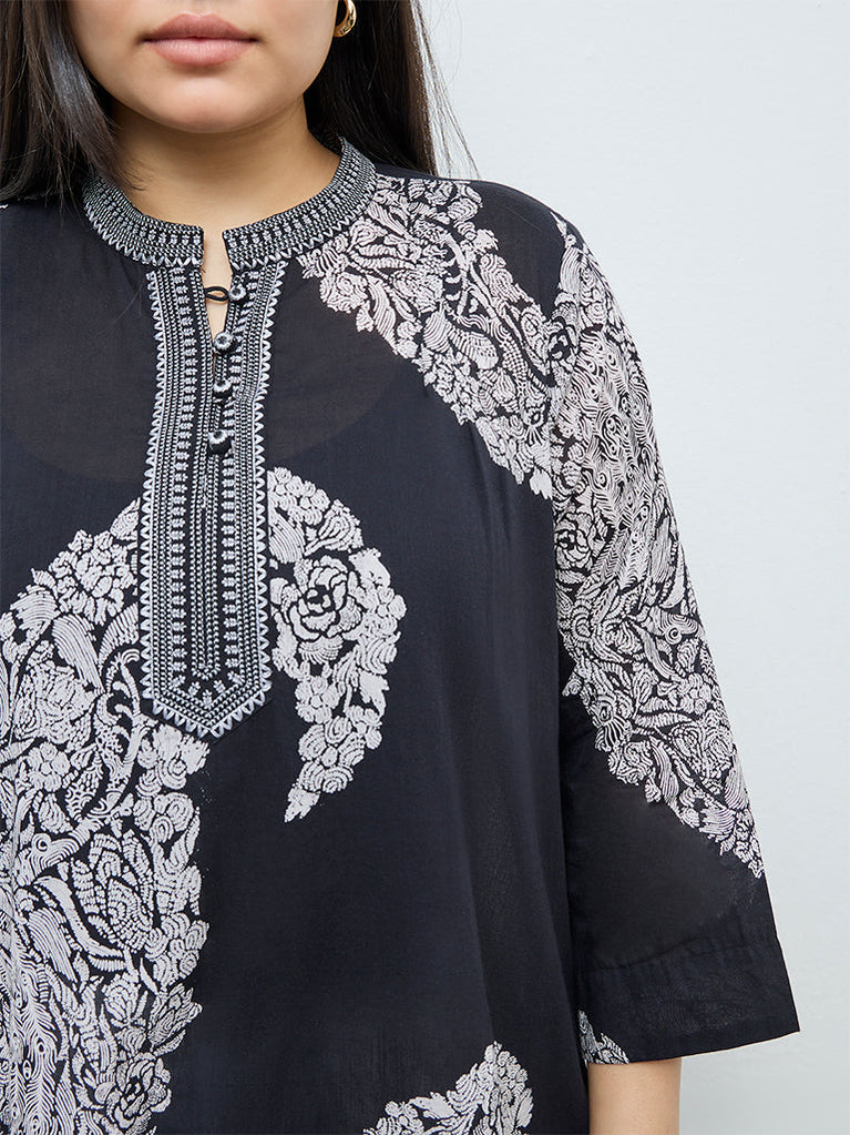 Channel timeless festive charm in this black Diza kurta, detailed with botanical motifs that lend a graceful, celebratory touch. Spun from a breathable fabric in an A-line silhouette, it is styled with a band-neck collar, a button placket, and three-quarter sleeves. A slip pocket completes the design, balancing elegance with ease.