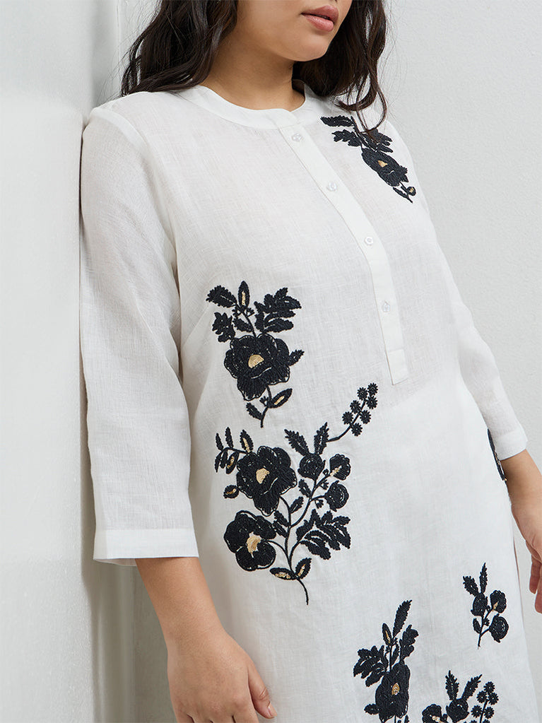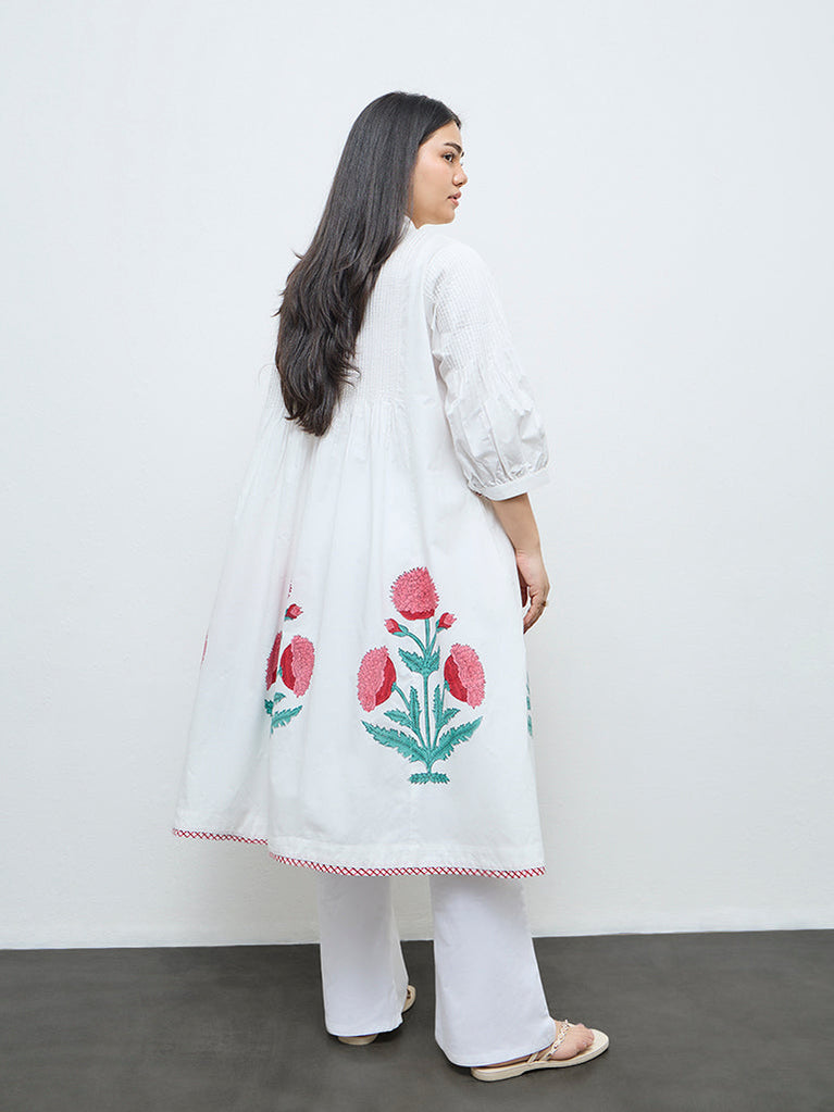 Diza White Floral Embroidered Cotton A-Line Kurta