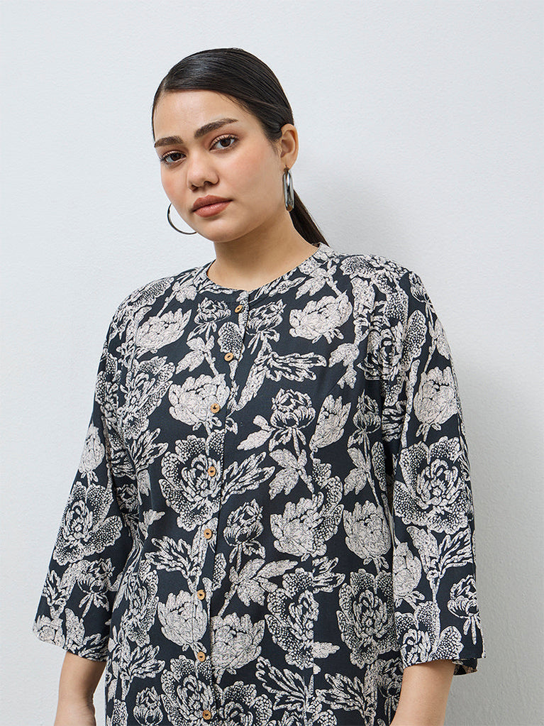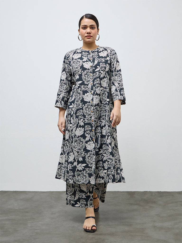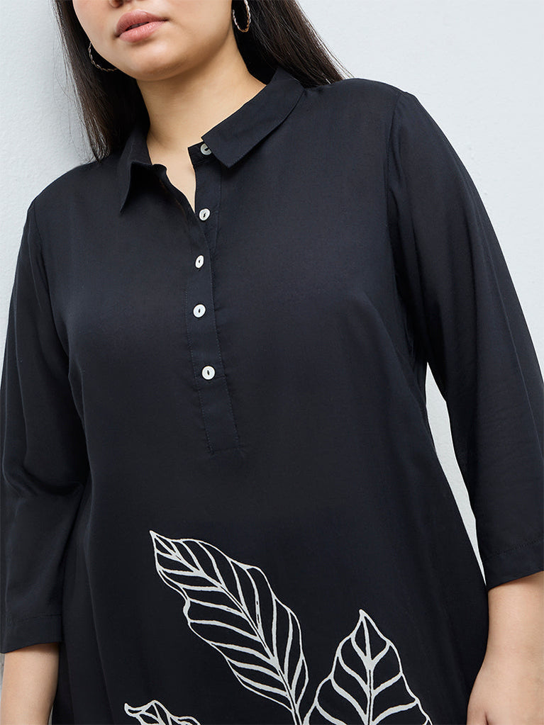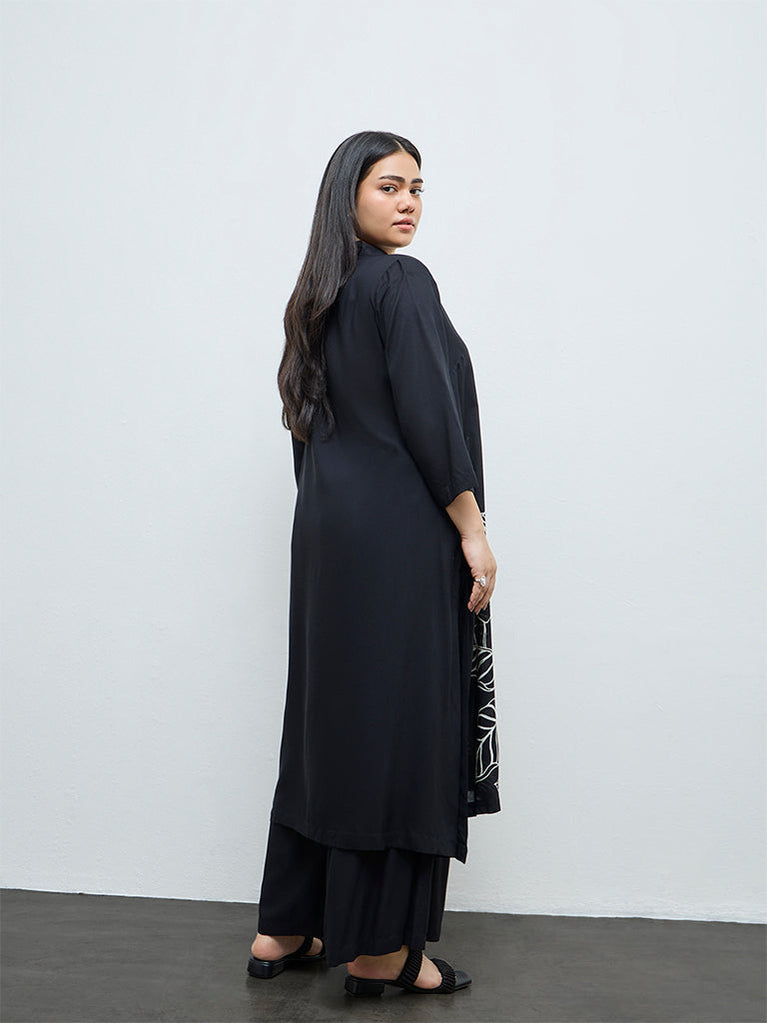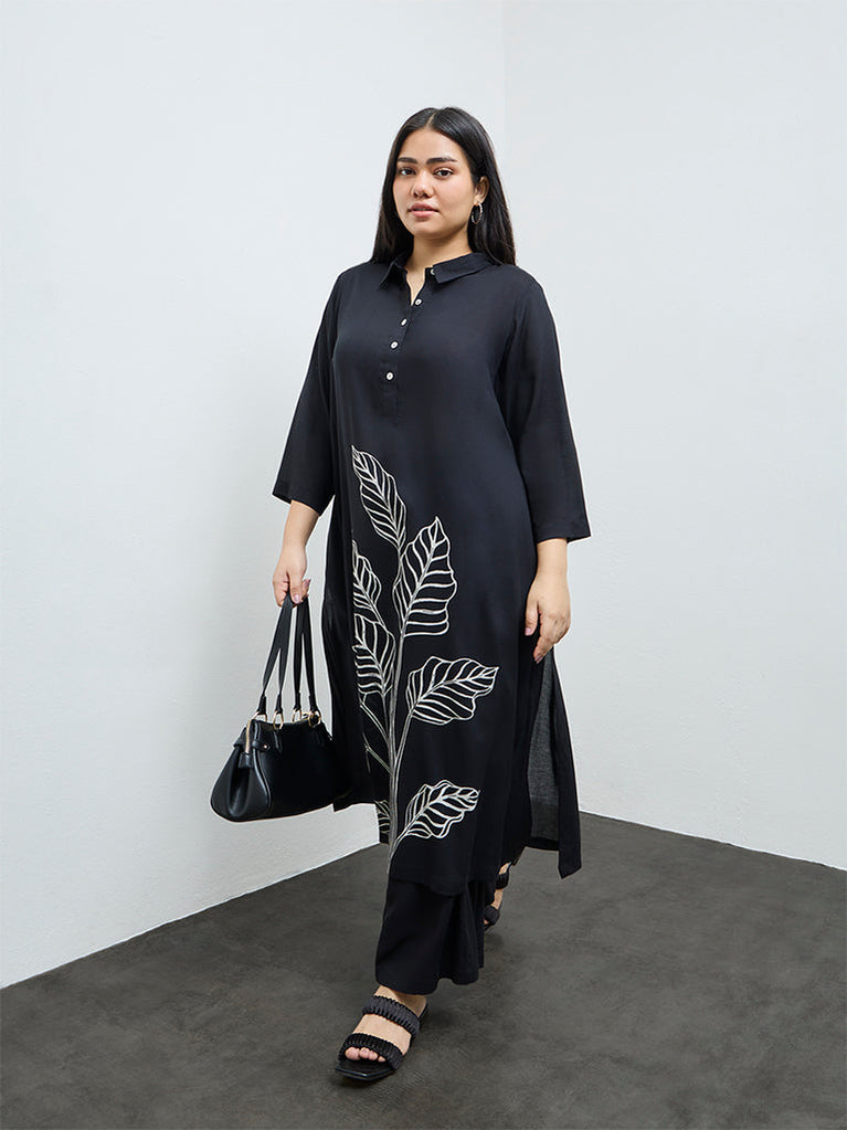 Designed to flatter with effortless structure, this black kurta from Diza is adorned with a foliage-inspired print across the front for a refined ethnic appeal. Crafted from a breathable fabric, it features a collared neckline that extends into a buttoned placket, offering clean definition through the bodice. Full sleeves provide balanced coverage, while discreet side pockets add everyday functionality.