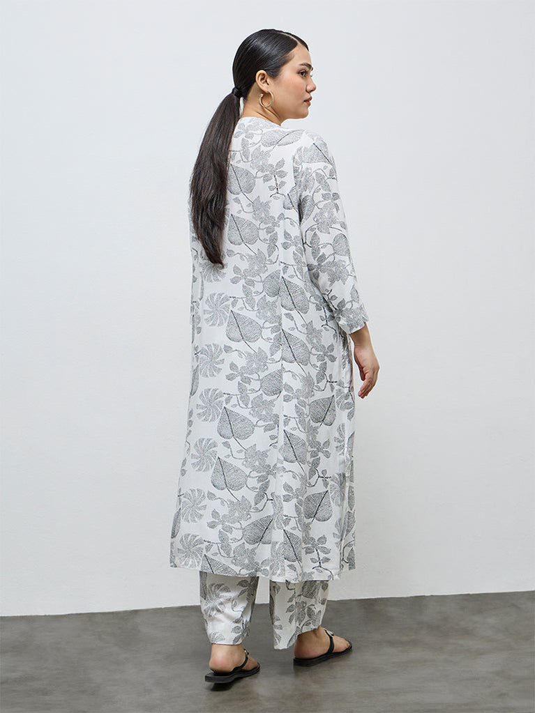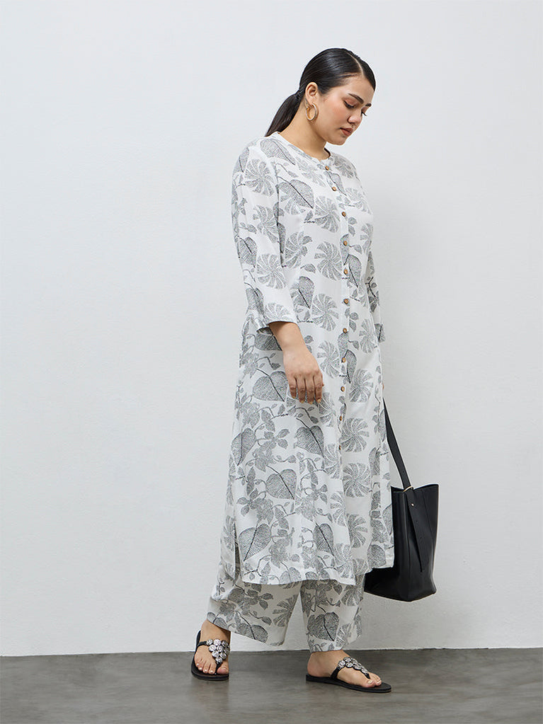 Float through the day in this white Diza kurta, detailed with delicate leaf patterns for a soft, nature-inspired look. Cut in an A-line silhouette from a breathable fabric, it features a refined band-neck collar, a buttoned placket, and three-quarter sleeves. A discreet slip pocket adds everyday ease to this thoughtfully designed ethnic staple.