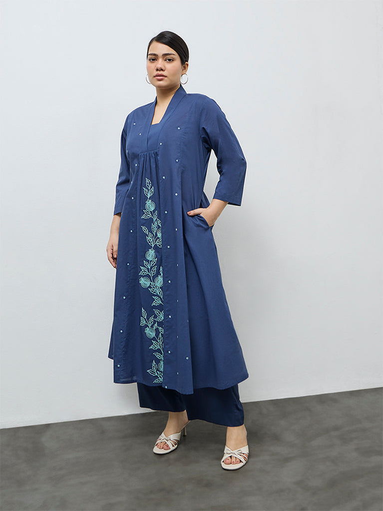 Diza Indigo Floral Embroidered Cotton A-Line Kurta