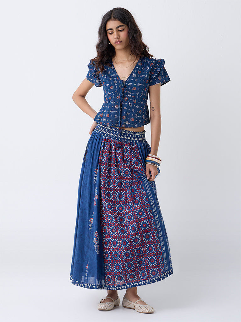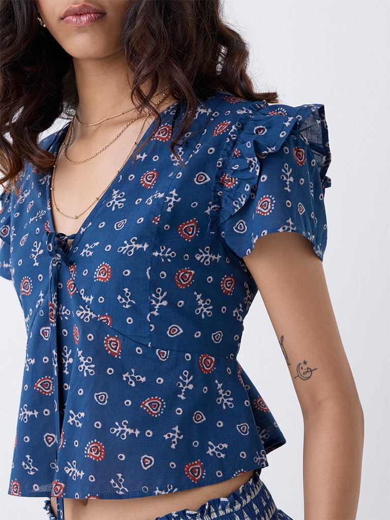 Bombay Paisley Blue Printed Cotton-Blend Top