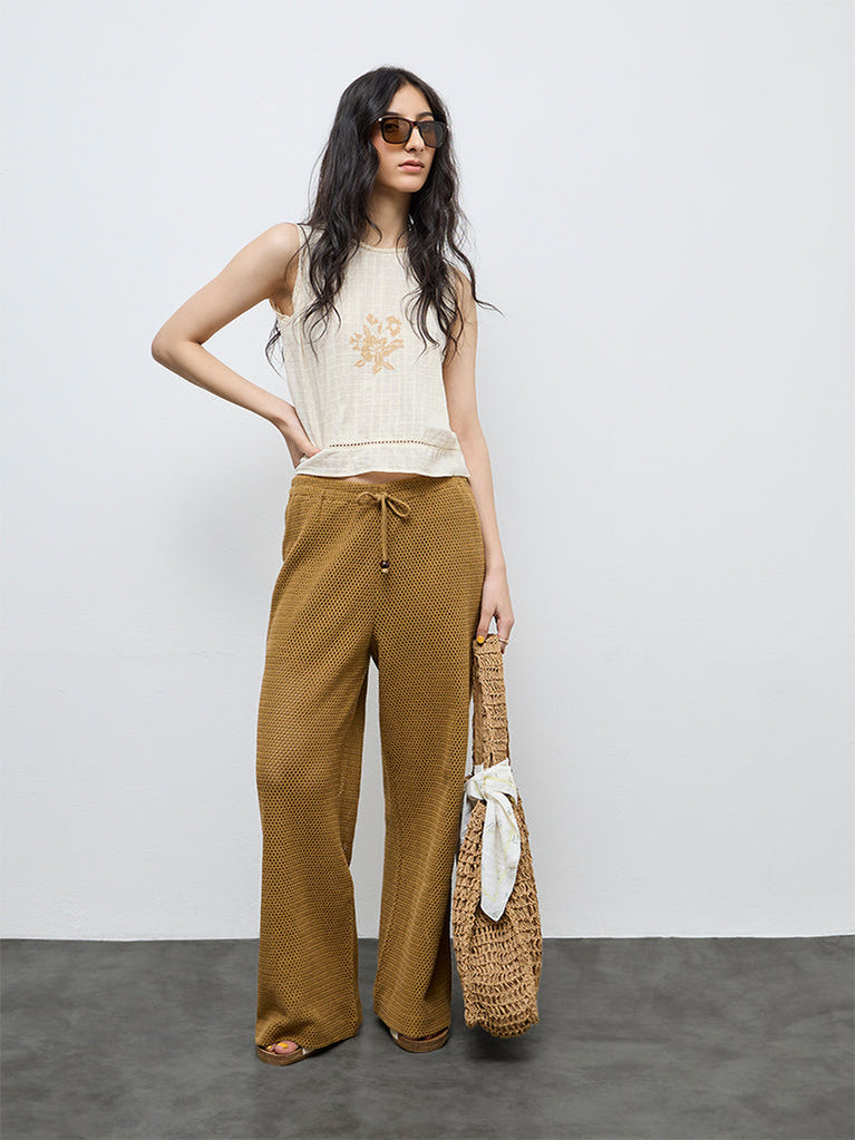 A refined take on everyday layering, this off-white top from Bombay Paisley brings subtle detailing into focus. Floral embroidery at the front adds a delicate accent, while lace-trim edges along the round neck and armholes lend a clean finish. The sleeveless silhouette keeps the design light and versatile. Crafted from breathable cotton fabric, the style is comfortable for relaxed daytime wear.