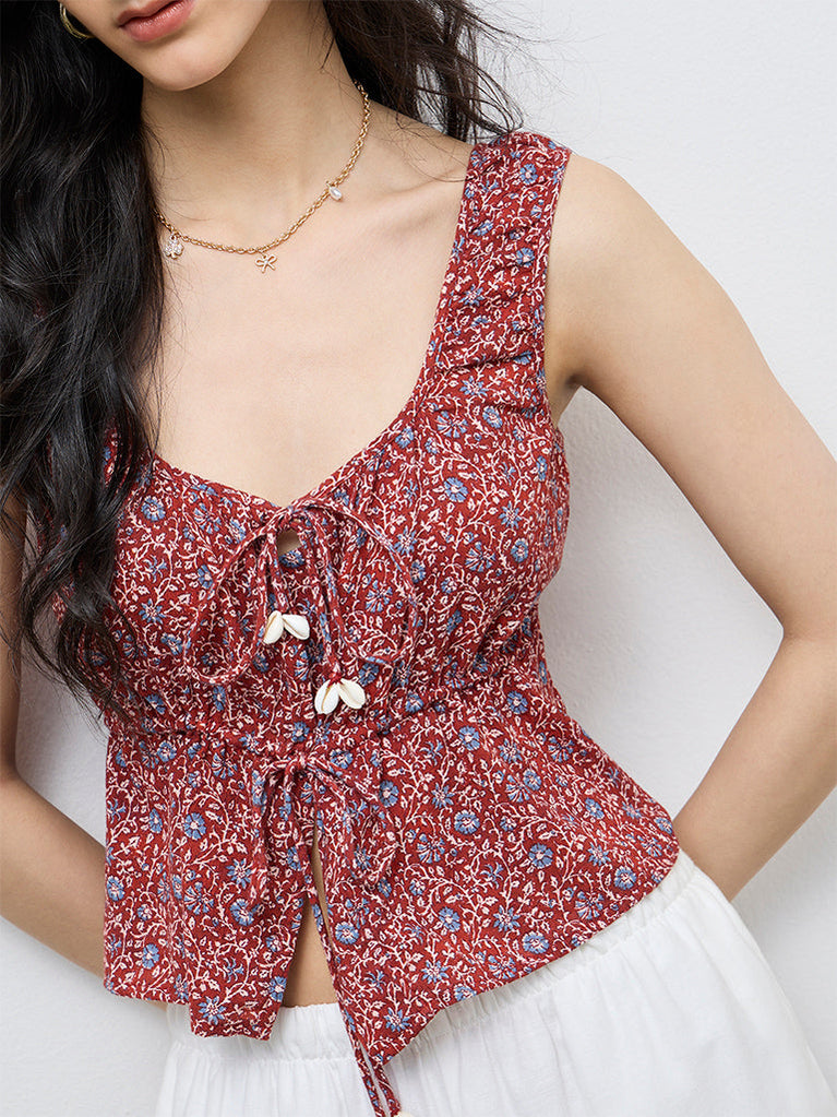 Bombay Paisley Red Floral Pattern Tie-Up Cotton Top