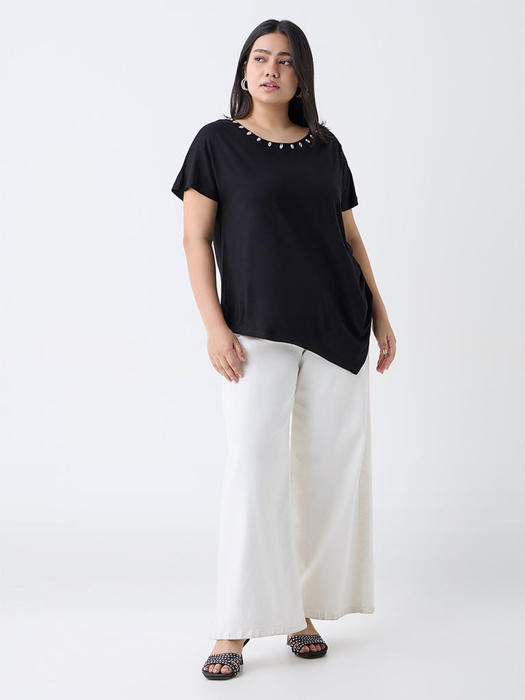 Gia introduces a touch of evening charm with this black top, styled with a graceful round neckline accented by sparkling diamanté detail. The relaxed silhouette and dolman sleeves create a fluid, flattering drape, while the asymmetric hemline adds a contemporary edge.