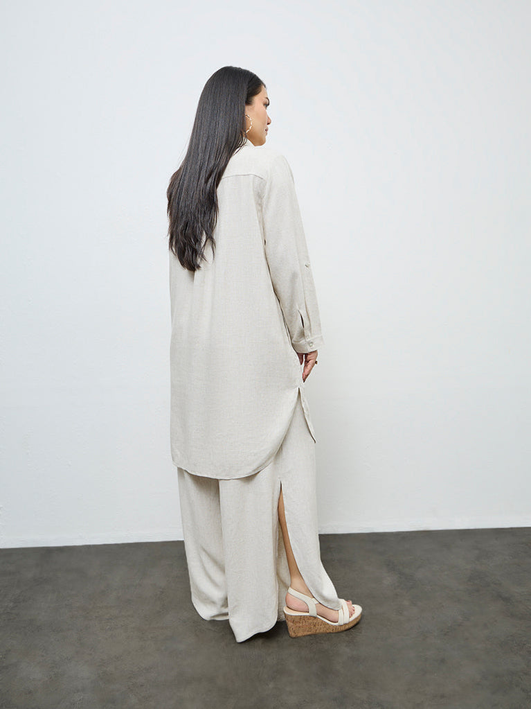 This beige tunic from Gia is a versatile staple for all your everyday basics. Styled with a notched collar, a button-up front and full sleeves, it is framed in an easy, relaxed silhouette. Made from soft, lightweight fabric, this is a dependable piece that balances both comfort and style.