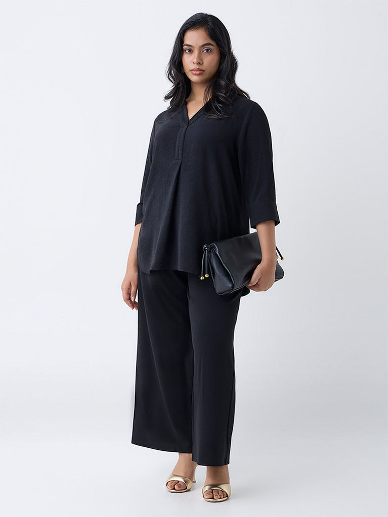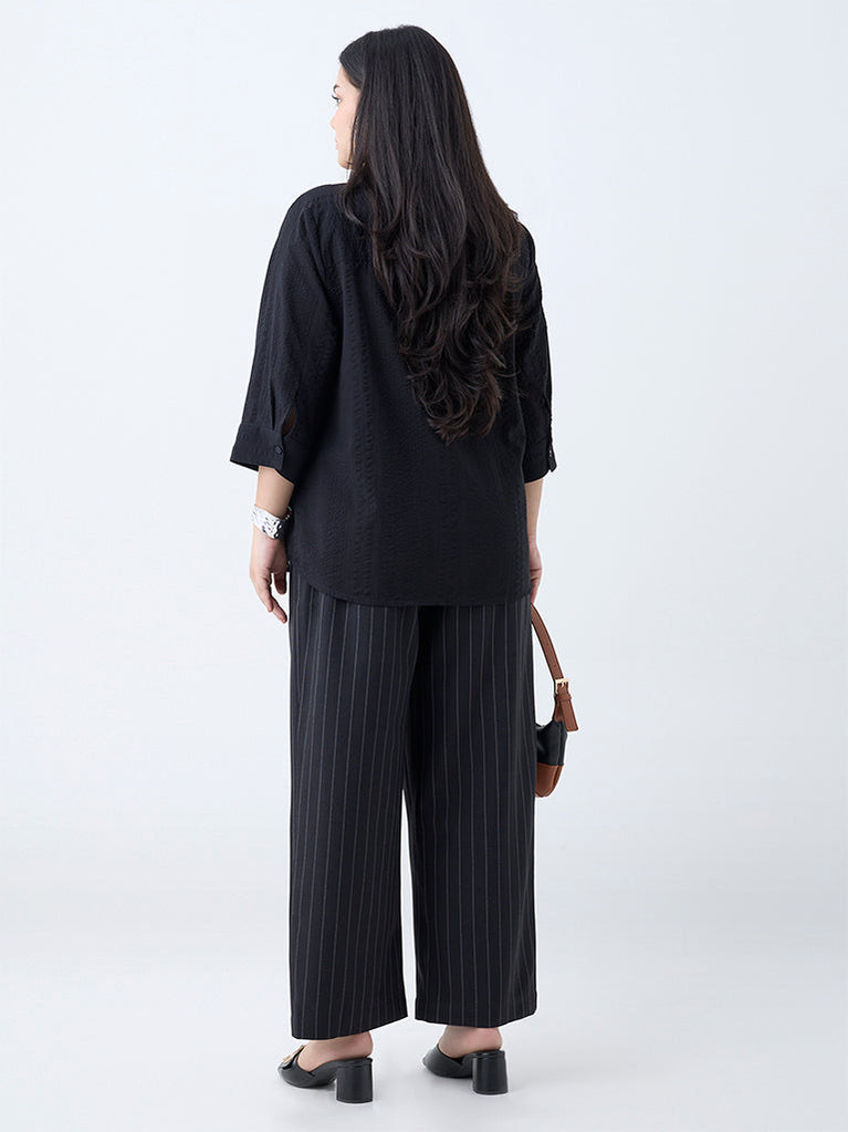 A modern essential, these black trousers by Gia offer timeless tailoring and contemporary ease. The structured waistband sits comfortably at the waist, while the classic pinstripe pattern adds subtle refinement. Designed with a straight cut, they move seamlessly from office-ready edits to polished casual pairings.