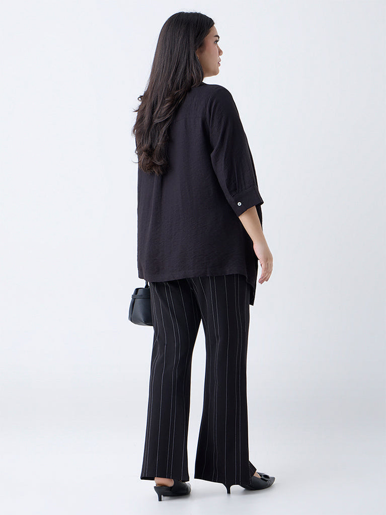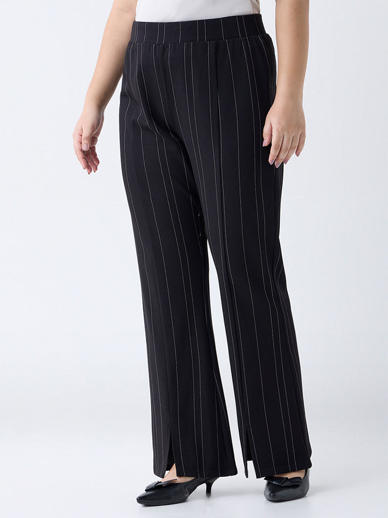 Ideal for dressier outings and evenings that demand understated elegance, these black bootcut trousers by Gia are tailored with fine pinstripes that elongate your frame. Made from a stretch-infused fabric and fitted with an elasticated waistband, they balance structure with comfort. The slit detailing at the hem adds a contemporary, flattering flourish—perfect for heels or sleek flats.