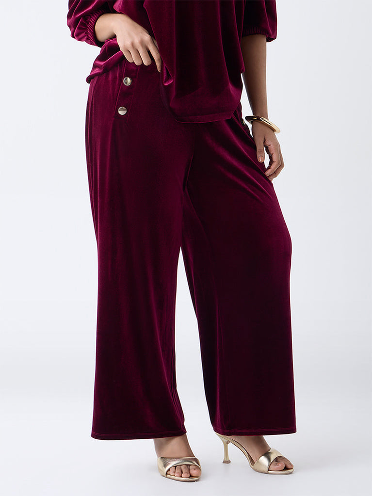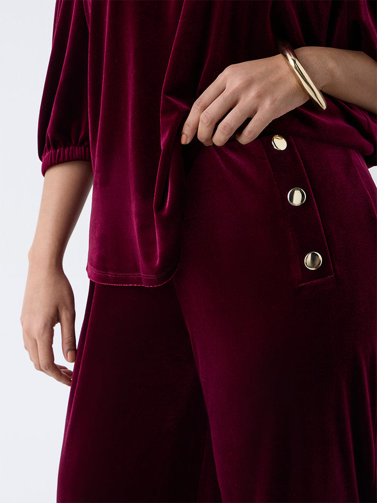 These maroon pants from Gia exude understated glamour. Crafted from a plush velvet fabric, they feature gold-toned button detailing on the side pockets for a hint of shine. The elasticated waistband ensures a flattering fit that pairs beautifully with evening blouses or casual knits.