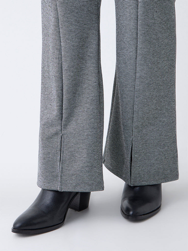 Gia introduces these grey trousers crafted from premium fabric in classic checks. Designed in a flattering bootcut silhouette, they offer a blend of structure and stretch for a smooth, contoured fit. The elasticated waistband provides secure comfort, while the refined pattern brings a polished edge to everyday dressing.
