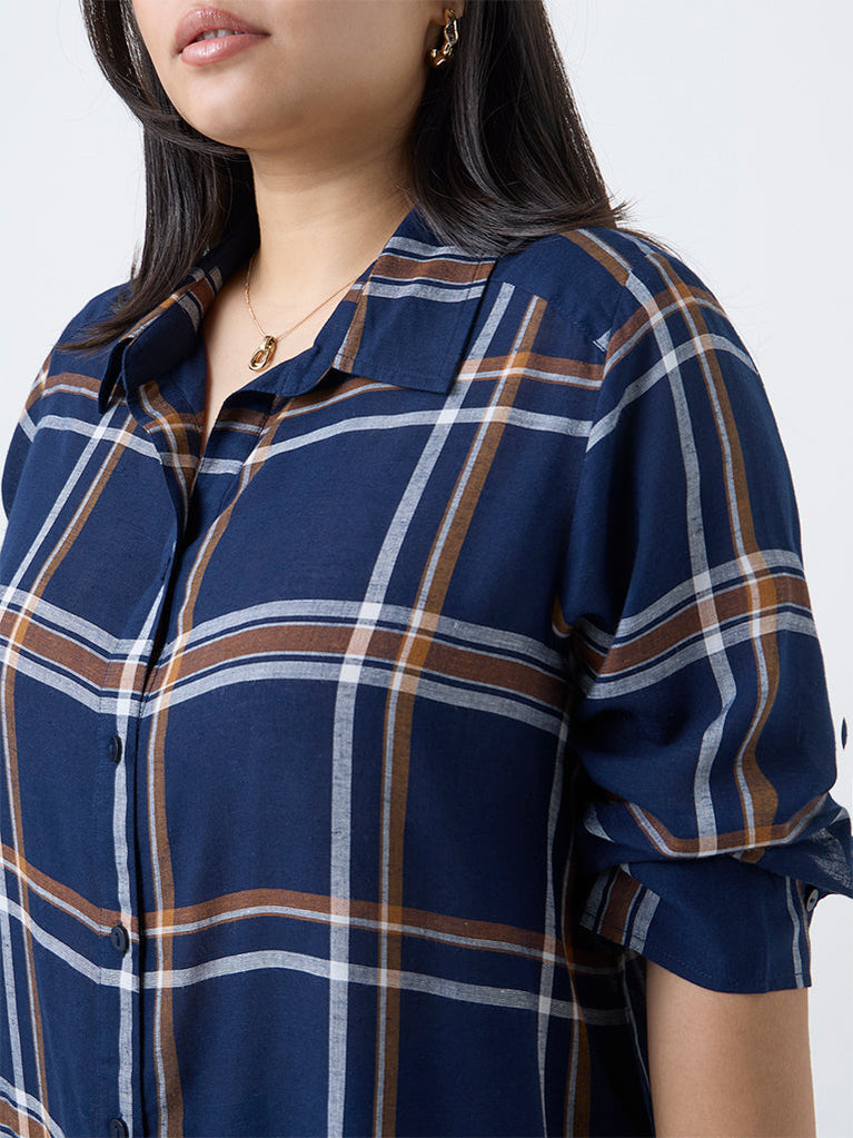 Gia launches this navy shirt defined by its checkered print that adds a contemporary touch to the classic silhouette. Crafted from an ultra-lightweight fabric that feels easy on the skin, it features a collar that leads into a button placket and three-quarter sleeves that offer relaxed wearability.