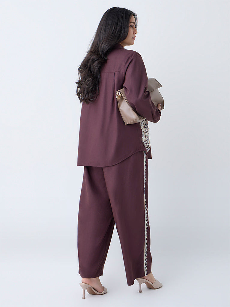 This dark brown shirt by Gia is beautifully detailed with intricate embroidery that brings depth and dimension to its refined design. Crafted from a sumptuous, drapey fabric that skims the body with ease, it features a structured collar and a concealed button placket for a clean, elongating front. Full sleeves with buttoned cuffs create a tailored finish perfect for dressing up denim or pairing with coordinated trousers.