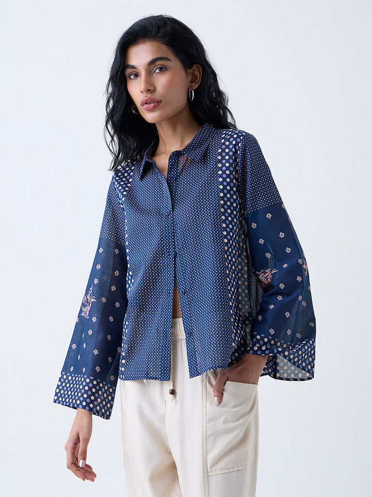 Bombay Paisley reimagines everyday staples with this dark blue Shirt, brought to life through alternating badla-inspired and miniature floral panels. Crafted from a smooth cotton-blend fabric, the silhouette features a classic collar, a button-down front and bell sleeves that create a soft, languid drape. A versatile piece suited to contemporary boho wardrobes.