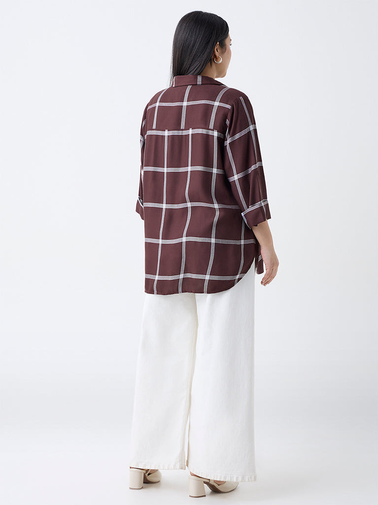 This dark brown shirt from Gia brings a modern touch to patterned dressing. Defined by neat check prints, it is woven from a lightweight fabric that feels airy through the day. The sharp collar, concealed button placket and three-quarter sleeves give it a tailored yet relaxed vibe.