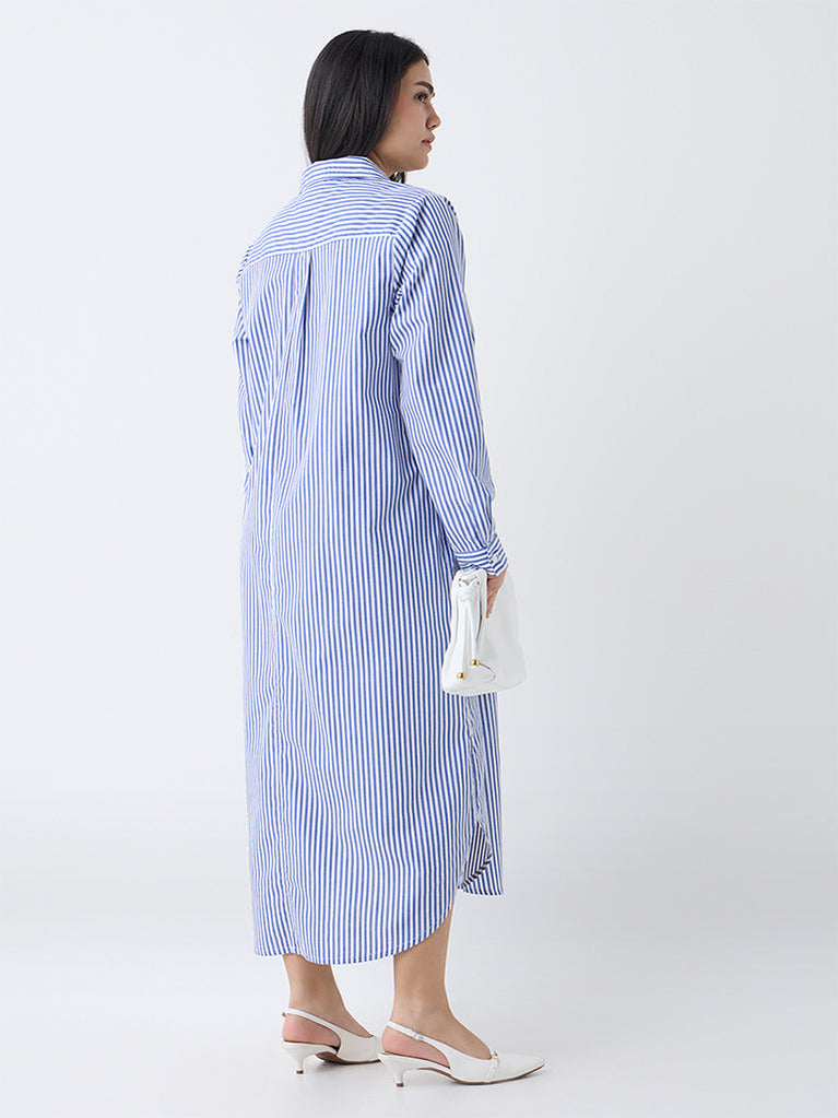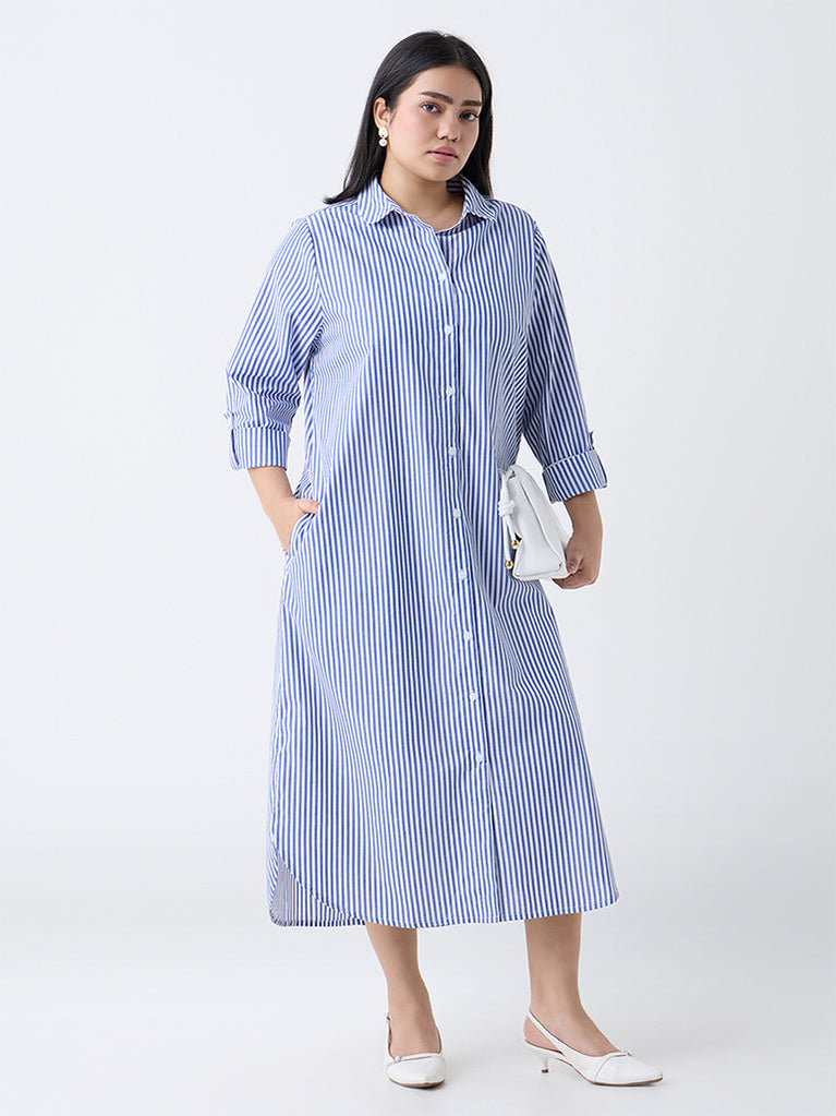 A true warm-weather staple, this blue striped shirtdress from Gia blends comfort with understated sophistication. Crafted from pure cotton, it features a crisp collar, button-down front and full sleeves that lend a refined silhouette. Handy side pockets add everyday practicality, making it a go-to for brunch plans, travel days or easy summer strolls.