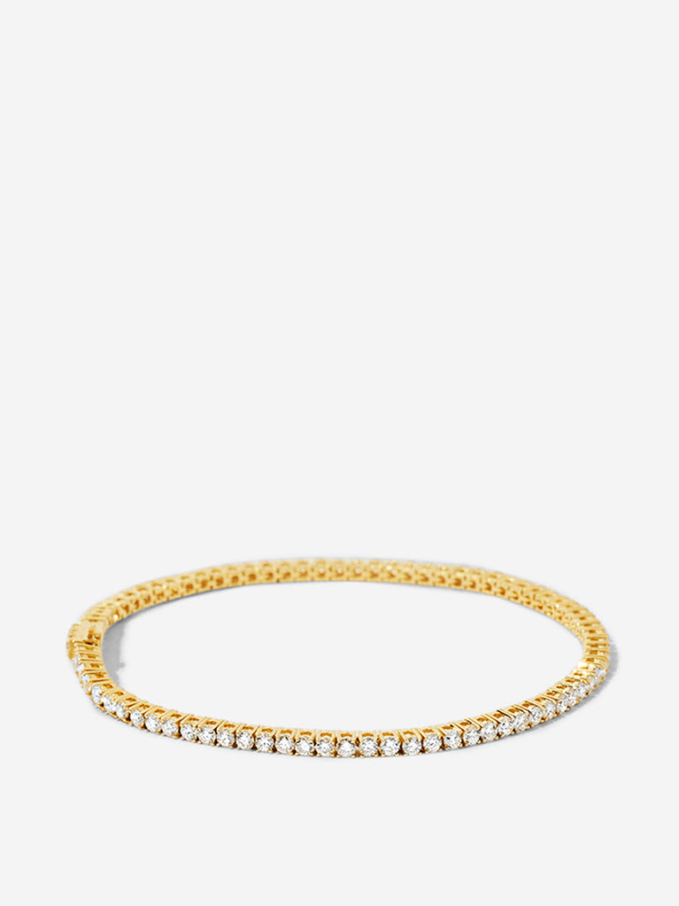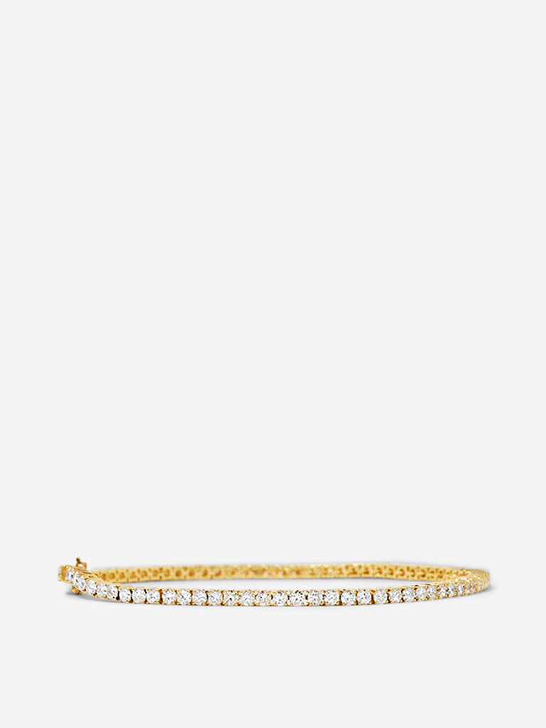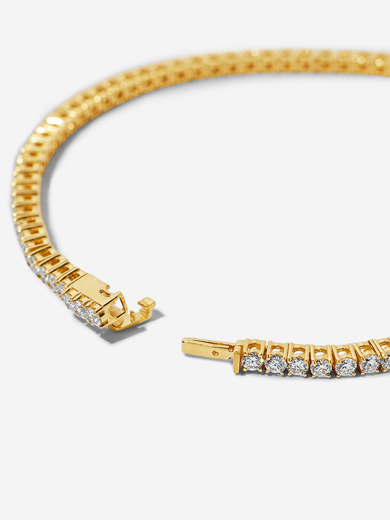 A refined interpretation of a timeless silhouette, this tennis bracelet features a continuous line of lab-grown diamonds secured in polished gold-vermeil settings. Each stone is positioned to reflect light with clarity, creating a fluid shimmer that moves gracefully with the wrist. The bracelet is finished with a secure clasp designed for comfort and ease. Its balanced proportions and luminous presence make it a statement of modern elegance that suits both everyday styling and more elevated occasions.