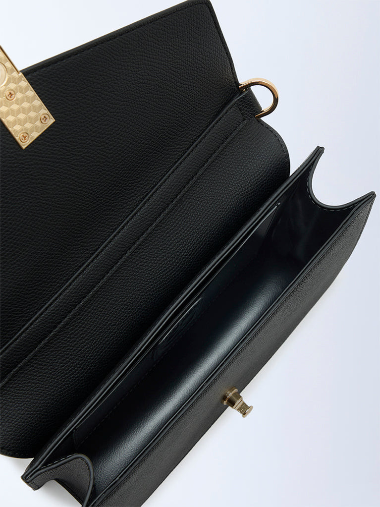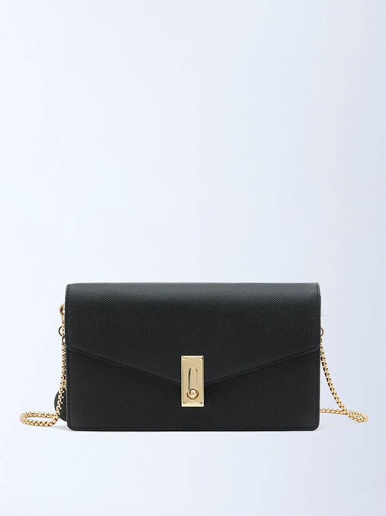 DescriptionDefined by modern elegance, this clutch creates a polished look.Accented with gold-tone detailing and a signature turn-lock closure, it features a chain strap for versatile styling.Crafted from genuine leather, the pocketed interior comfortably holds your phone, cards, and keys, making it an effortless go-anywhere carryall.