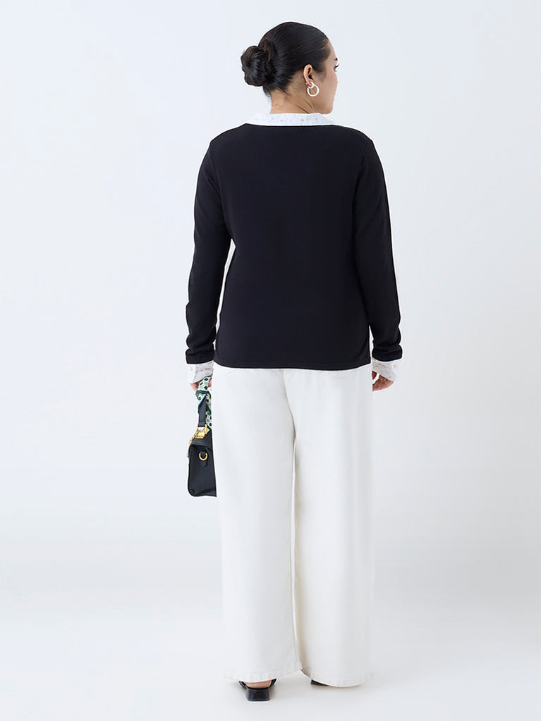 This black sweater from Gia is designed to take you from desk to dinner with quiet sophistication. Defined by its lace-detailed V-neck collar and cuffs, it is crafted from quality fabric and finished with full sleeves.