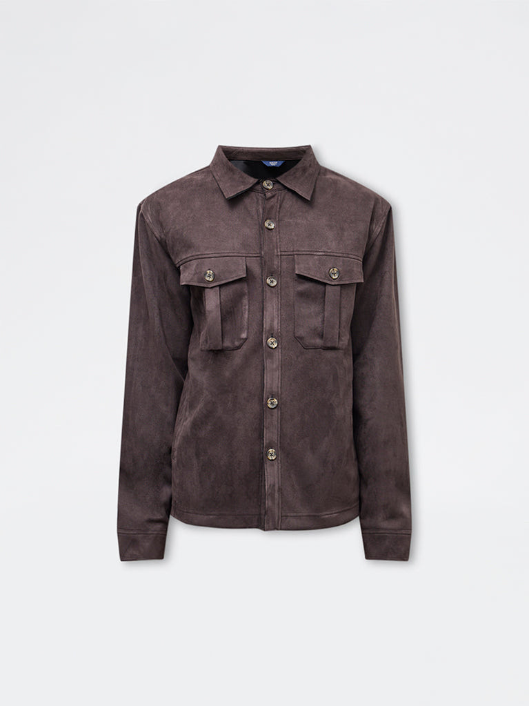 Layering takes on a refined edge with this dark brown jacket from Ascot. Structure in a relaxed fit, it features a crisp collar, a button-up front, full sleeves, and envelope pockets for a clean, structured look. Milled from a premium-blend fabric with a suede finish, it offers a smooth hand feel suited for cooler days and elevated casual styling.