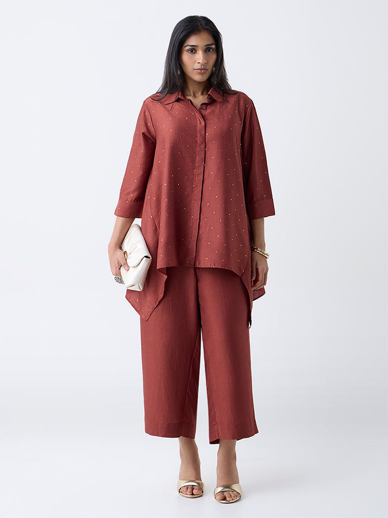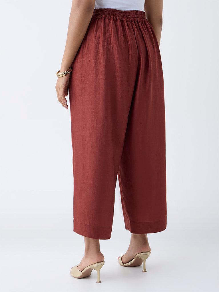 These rust ethnic pants from Diza are tailored from a breathable fabric for day-long comfort. Designed with an elasticated waistband and functional side pockets, they ensure a relaxed fit.