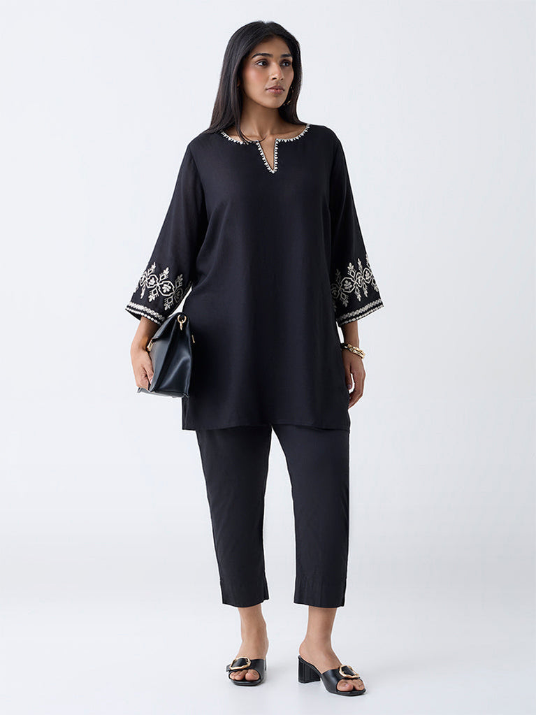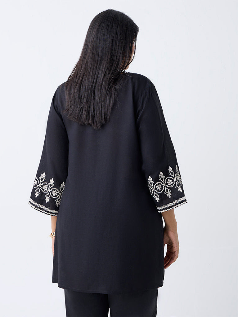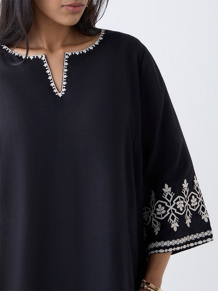 Diza brings this black tunic featuring intricate embroidery along the split neck and three-quarter sleeves for a refined ethnic appeal. It is crafted from soft, breathable fabric for all-day ease. A timeless addition to contemporary ethnic wardrobes.