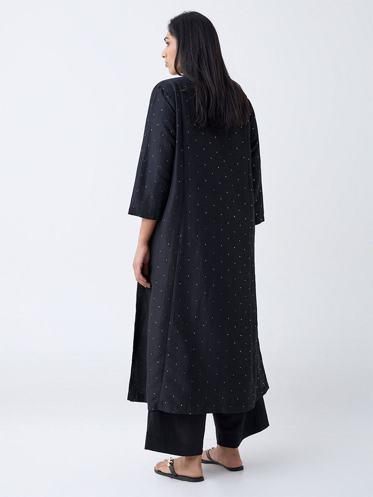 This black kurta from Diza stands out with its subtle embellishments across an A-line frame. Spun from a premium fabric blend, it features a V-neck and three-quarter sleeves for a composed finish. A refined option that transitions effortlessly through everyday ethnic wear.