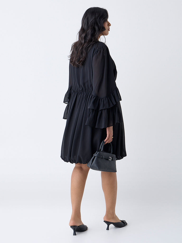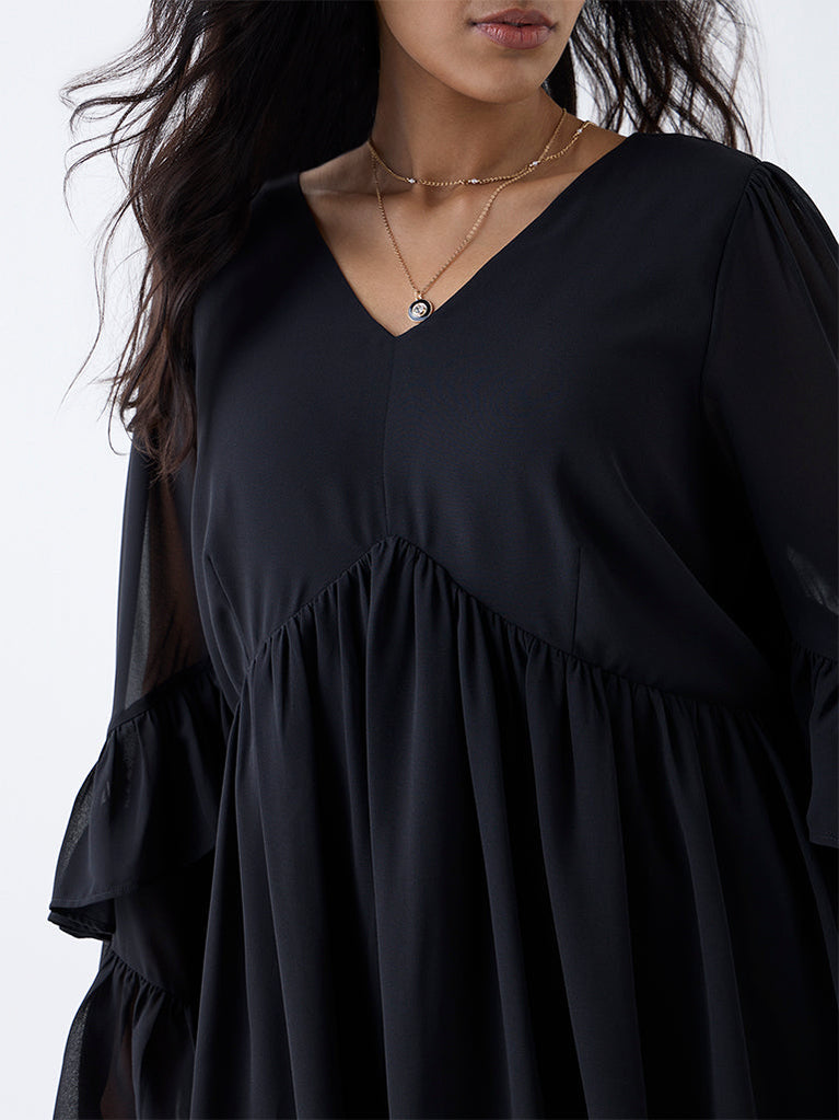 Gia presents this black dress crafted in a balloon silhouette for a fluid, airy drape. It features a V-neck and ruffled flute sleeves that add dimension to the design. Spun from breathable fabric, it delivers comfort with a polished appeal.